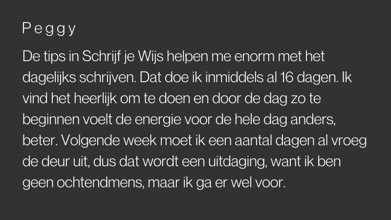 De tips in Schrijf je Wijs helpen me enorm met het dagelijks schrijven. Dat doe ik inmiddels al 16 dagen. Ik vind het heerlijk om te doen en door de dag zo te beginnen voelt de energie voor de hele dag anders, beter. Volgende week moet ik een aantal dagen al vroeg de deur uit, dus dat wordt een uitdaging, want ik ben geen ochtendmens, maar ik ga er wel voor.