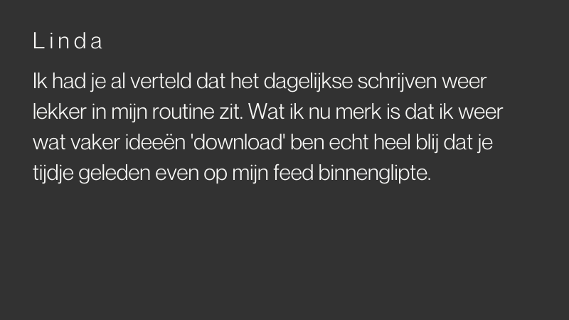 Ik had je al verteld dat het dagelijkse schrijven weer lekker in mijn routine zit. Wat ik nu merk is dat ik weer wat vaker ideeën 'download' ben echt heel blij dat je tijdje geleden even op mijn feed binnenglipte.